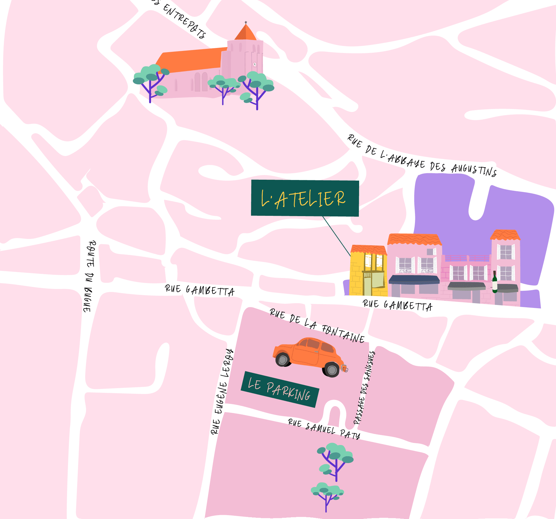 L’atelier est au rez-de-chaussée. Il est possible de se garer dans la rue ou dans le parking situé rue Samuel Paty (rue parallèle à l’atelier).